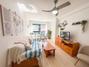 La zona de salón y cocina americana es moderna y funcional, creando un espacio abierto y acogedor. La cocina está completamente equipada con electrodomésticos, y desde el salón se puede disfrutar de hermosas vistas a los jardines comunitarios y la piscina, creando un ambiente relajante ideal para compartir momentos con familiares o amigos.