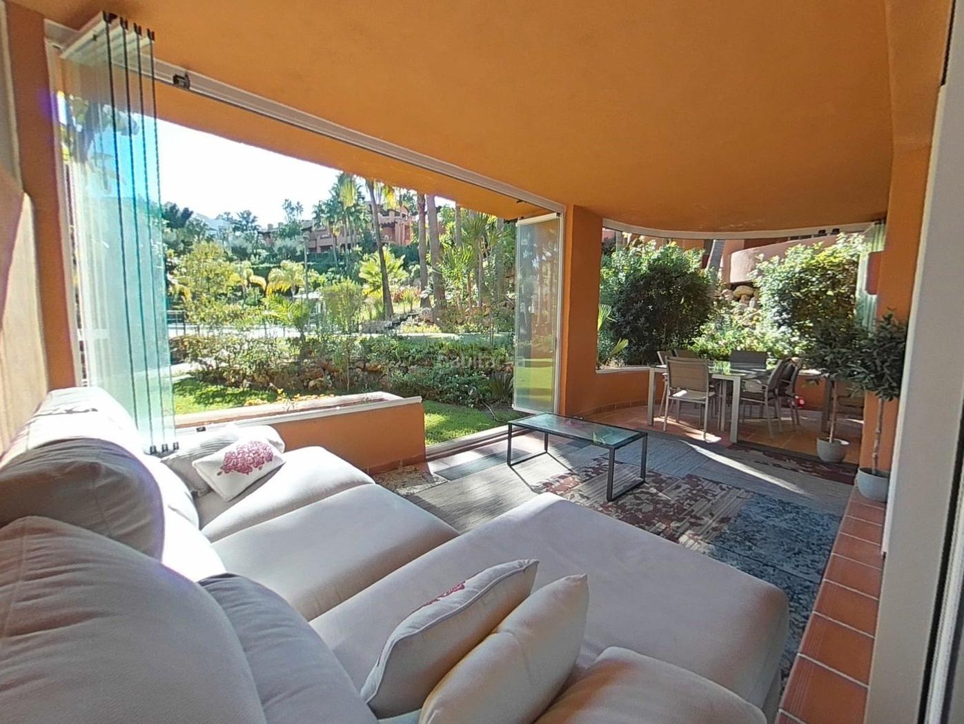 Impresionante planta baja con acabados de alta calidad en una de las mejores zonas residenciales de Nueva Andalucía. Esta inmensa planta baja consta de 4 habitaciones dobles con armarios empotrados, 2 de ellas en suite, ideal para familias numerosas o para quienes reciben visitas durante todo el año. Cuenta con un amplio salón de unos 50m2 con acceso a una terraza muy grande con zona de barbacoa, cerramientos de cristal retráctiles que son perfectos para mantener la temperatura ideal todo el año sin perder luz natural y acceso directo a la piscina y jardines comunitarios. La cocina es amplia, equipada con electrodomésticos de alta calidad, amplio espacio de almacenamiento y un lavadero con almacenamiento adicional. Cabe mencionar que todas las estancias de esta propiedad tienen ventanas que dan al exterior, lo que proporciona una amplia iluminación natural. Además, hay un gran trastero y una plaza de aparcamiento donde los propietarios solían aparcar un todoterreno, un coche pequeño y una moto. Las zonas comunes cuentan con jardines con una increíble vegetación tropical, una piscina única con un chiringuito de diseño muy atractivo. Todas las zonas comunes están bien cuidadas, incluidos los accesos, la zona de aparcamiento, los jardines y la piscina, entre otros. El complejo residencial fue construido en 2007 por el Grupo Insur, diseñado para los clientes más exigentes que buscan descanso y calidad. Ubicado en la famosa y exclusiva zona de Cerquilla, cerca del Club de Golf Los Naranjos, colegios privados, restaurantes y a solo unos minutos de Puerto Banús y del centro de Marbella.
