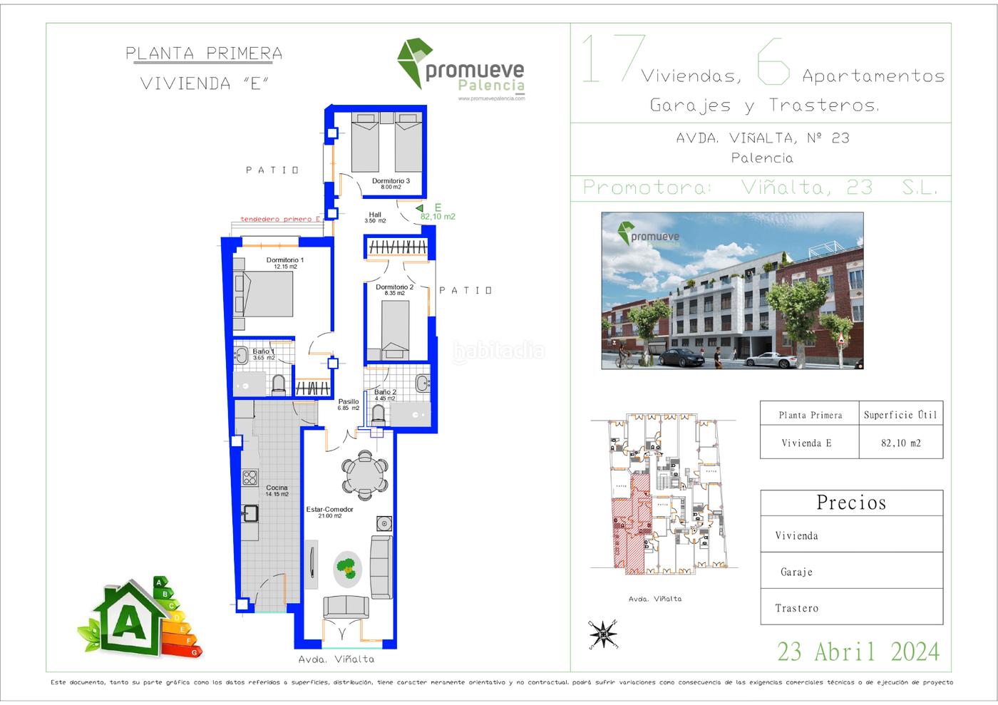 Nueva promoción de viviendas con garajes y trasteros ubicadas en un enclave natural de la capital Palentina, junto al canal, y a un paso del centro de Palencia. Se oferta vivienda de 82 m2 útiles en planta primera, tres dormitorios y dos baños con amplio salón estar comedor. Este edificio de nueva construcción te da la oportunidad de disfrutar de las mejores calidades en tu vivienda, con materiales de 1ª calidad de primeras firmas nacionales e internacionales, puertas de paso acabadas en lacado liso en blanco. Estas viviendas estarán dotadas de una instalación de aerotermia, para calefacción, ACS y suelo refrigerante, una energía limpia, renovable que favorece al medio ambiente y mediante la cual se consigue un ahorro de hasta 70%.