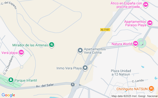 Vera Playa es conocida por sus largas playas de arena, su estilo de vida relajado y sus excelentes servicios. La urbanización se encuentra en una zona tranquila pero bien comunicada, con fácil acceso a los servicios y al transporte. Distancias clave: