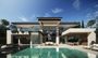 El área exterior incluye un jardín con una piscina de diferentes profundidades, un Pool Bar, una cascada desde la terraza y un área de comedor cubierta. La planta superior alberga un dormitorio principal con vestidor y baño en suite, y dos dormitorios adicionales en suite. El solárium cuenta con su propia piscina y área de barbacoa.