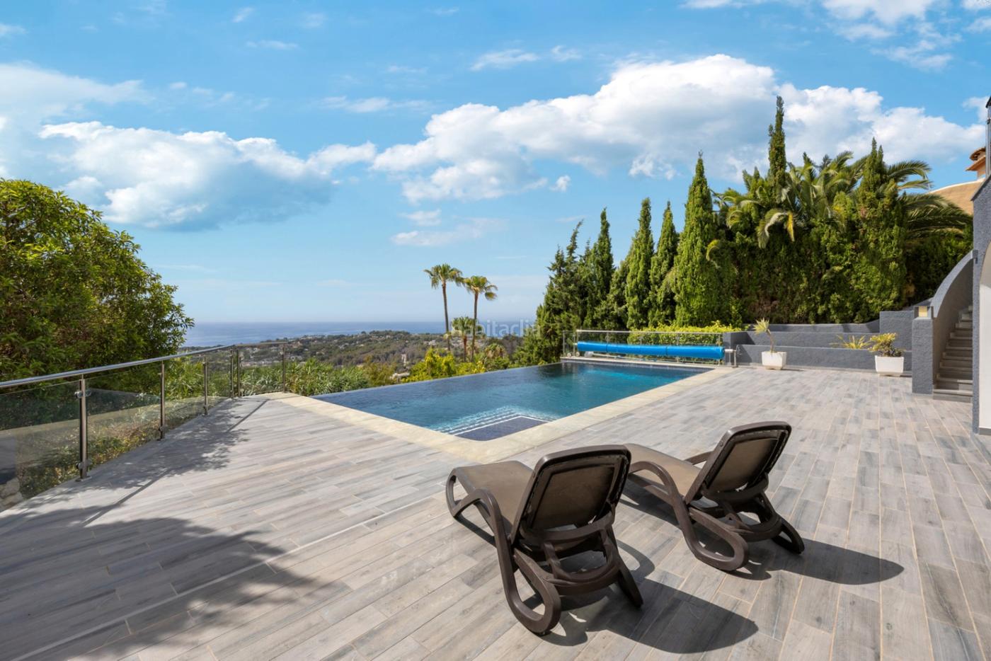 Desde la entrada principal de la villa, unas escaleras te guían hasta el área de la piscina infinita, diseñada para la relajación y el entretenimiento. Aquí encontrarás una cocina de verano, un aseo para invitados y un trastero. La piscina en sí está climatizada con una bomba de calor, asegurando su disfrute durante todo el año.