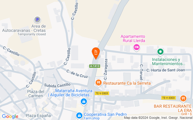 - Está situada a 8 Km de Cretas por camino rural en buen estado y a 3 Km de la carretera que une Torre del Compte con la Carretera Nacional 420.