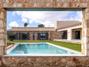 La superficie habitable se divide en cinco dormitorios y seis baños en la planta baja. La casa cuenta con todas las comodidades modernas. En el exterior, la propiedad ofrece terrazas abiertas y cubiertas, un gran jardín con césped, una piscina de agua salada y un garaje. Las características incluyen calefacción por suelo radiante, aire acondicionado, chimenea, doble acristalamiento, persianas y un sistema de riego automático.