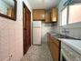 Una cocina rectangular y conservada que cuenta con una galería adjunta con ventanas a un patio de manzana y un baño con bañera.
