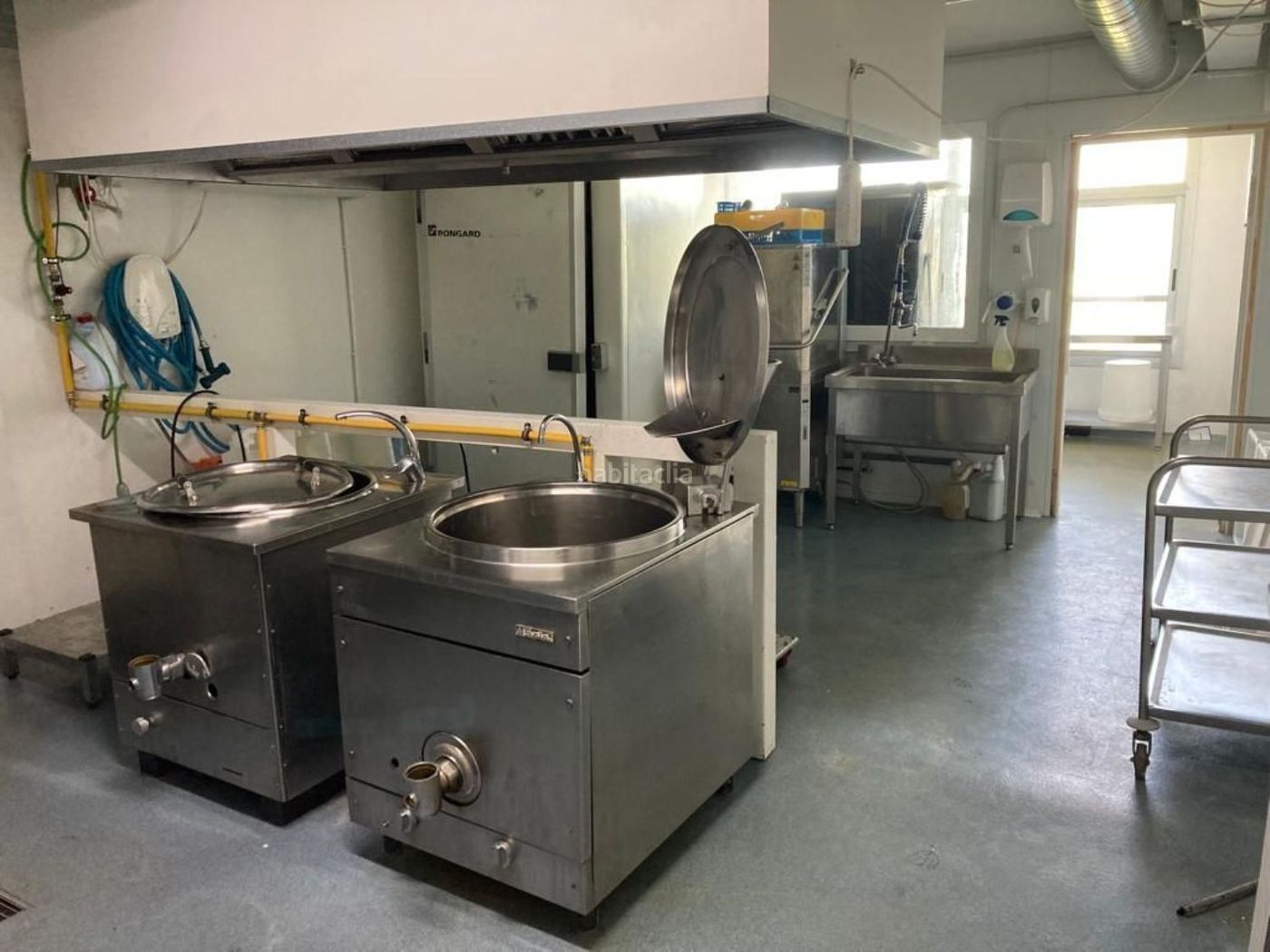 Cocina + Área de lavado: campana extractora isla, horno de convección grande (cabe un carro dentro), 1 pequeña vitro, 1 mesa de trabajo, 1 abatidor de carro, lavavajillas de capota, pica industrial y máquina de desinfección. Cuenta con tubo de exportación y aportación de aire.